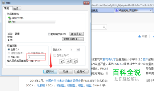 然后在范围里面选择“全部”,或者“页码”,这时打印的是全部页面或者是你选择的页码范围,然后单击“打印”这样你就可以直接把网页上的内容打印出来。
