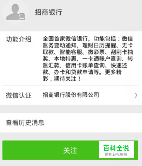 在微信公众账号的界面下搜索【招商银行】然后再关注它。