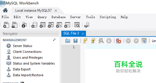 使用MySQL Workbench管理工具连接上MySQL数据库,新建一个【SQL File】,用于书写sql语句。如果你使用的是其他MySQL管理工具也是一样的