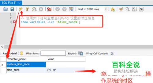 在【SQL File】中输入并执行如下SQL语句,用于查看当前MySQL设置的时区信息 show variables like '%time_zone%';