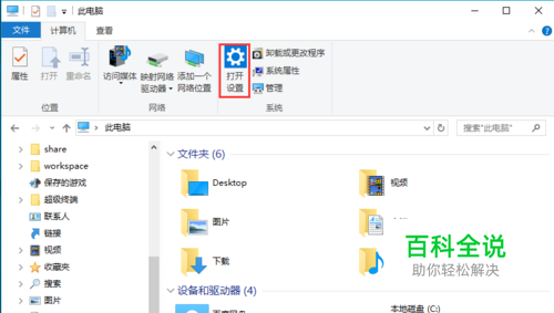 在win10的桌面上,请打开“此电脑”,在其界面中,可以看到有一项是“打开设置”的图标。