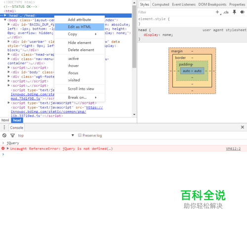 在控制台的Elements栏的head标签上点击右键,点击Edit as HTML