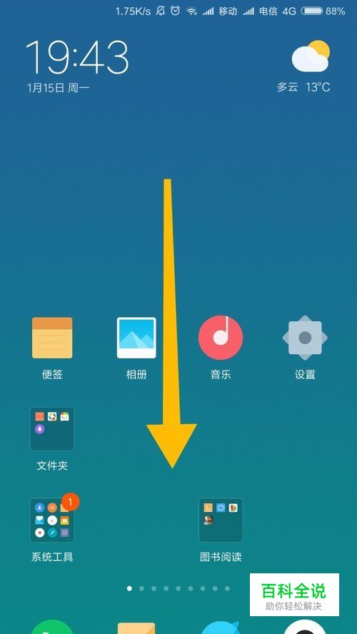 首先我们回到手机的主页面,然后往下方滑动。如下图所示。