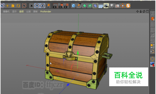 选用一个之前做的宝箱模型,这个模型已给好了材质,天空环境设为摄像机不可见。渲染后,可以在图片查看器中看出,模型的背景为一片漆墨。这就是没有背景的渲染效果。那怎么让PS识别出图片是透明的呢?直接保存是不会产生透明背景的。