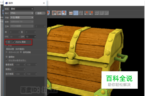在图片查看器中完成渲染后,鼠标点左上角的另存为;在弹出的对话框中选类型为“静帧”,格式为“PNG”,勾选层,Alpha通道。点确定。