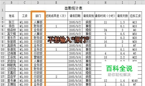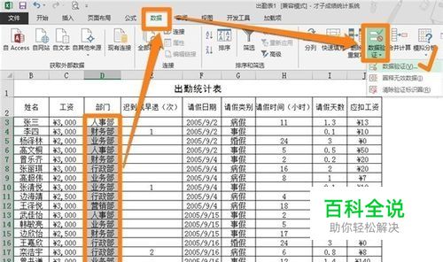 打开一个“出勤统计表”,我们看到里面有“部门”列。如果不想每次都输入部门名称,可以采用以下方法: 将“部门”这一列选中,依次点击“数据”——“数据验证”。