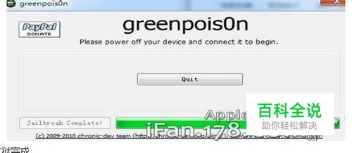 二、越狱 1、解压越狱教程并运行greenpois0n.exe 2、ipad3平板电脑连接电脑,然后按开关按钮,出现提示后滑动屏幕,将其关机 3、然后点击greenpois0n程序正中间的"Prepare to Jailbreak (DFU)"按钮,出现读秒 4、有3秒时间给你做好准备工作,这时,你的左手放在ipad3关机按钮位置,右手放在HOME按钮位置,准备待命。然后根据屏幕上的提示,分别进行以下操作。左手保持按住电源按钮2秒 5、左手保持按住电源按钮不要松开,右手同时按下HOME按钮,保持此状态10秒左右 6、左手电源按钮松开,右手保持按住HOME按钮,大概保持15秒 7、如果以上步骤操作正确,将会进入写入模式 8、按下"Jailbreak!"按钮,程序将自动进行越狱操作,进度条会滚动 9、数秒后,你的ipad3的屏幕背景上会有数行白色的英文文字滚动,请耐心等待其运行结束,直到ipad3自动重启,出现白色的苹果图标。 10、如果你曾经出现过不完美越狱过,至此越狱已经全部完成,你可以点击"Quit"按钮退出,再也不用困扰关机的问题了。 11、越狱完成 12、到cydia里安装5.X的ipa破解补丁