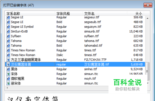打开“文件→打开已安装字体”,如图,答主以“汉仪南宫体简”为例,修改为“1汉仪南宫体简”,以便此字体排在字体列表前面,方便使用;