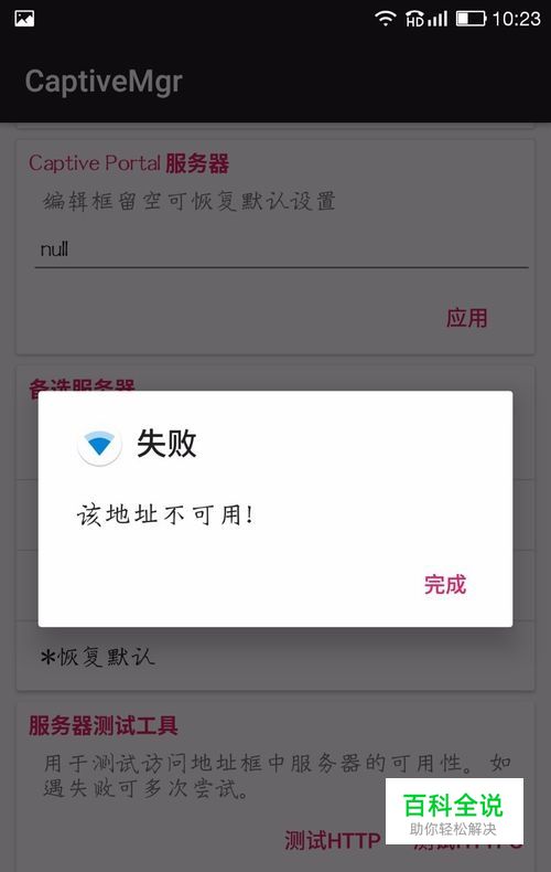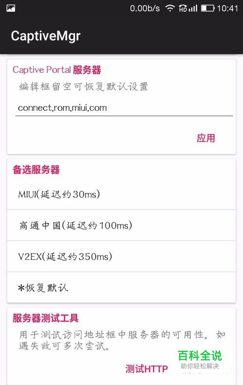 具体是因为系统还是流氓软件还不清楚,但广告是因为系统收到了错误的回应信息,只要指定正确的主机,能够收到正确的回应,就不会再弹出广告。利用CaptiveMgr(下载地址在后面)可以指定主机,打开软件后点击服务器测试工具"测试http"返回失败信息,说明目前的主机是错误的。 小贴士:由于更改系统设置,软件运行需要root权限