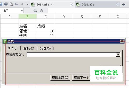 然后再打开第一个文件(2013.xls)中,按下:ctrl+f 组合键;弹出查找对话框,如下图: