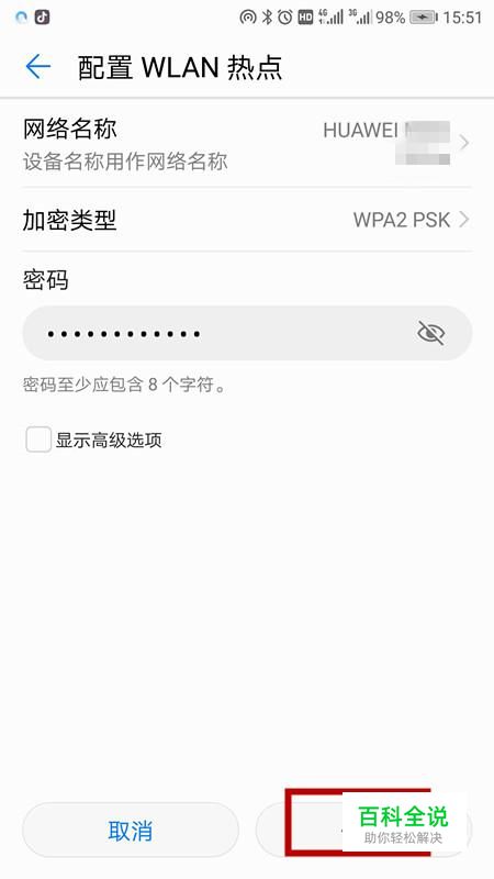 最后输入密码,配置好便携式WLAN热点后点击保存即可。如图所示。