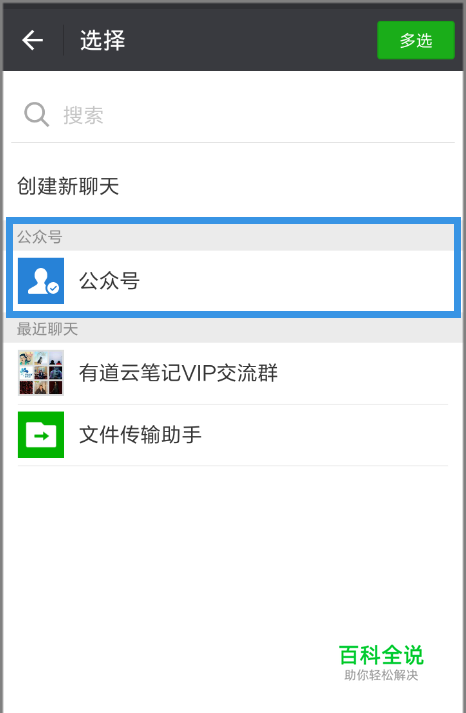 第2步,在“公众号”中选择“有道云笔记”,发送即可