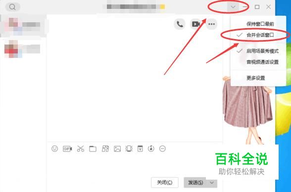 右上角图标 然后点击聊天对话框的【右上角】图标,可以看到【合并聊天窗口】是勾选的,所以它才会呈现合并状态,如下图所示: