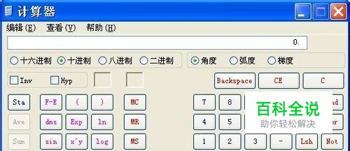 这时计算器的界面发生了变化,出现了很多按钮,也就是很多计算方式,我们计算阶乘是十进制的,所以选择其中的“十进制”、“角度”。如果是其它进制的,相应选择其它进制即可。