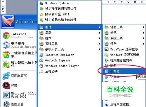打开桌面下方的“开始”按钮,选择其中“所有程序”,在出现的程序里找“附件”,在“附件”的下方选择“计算器”。这就打开了XP系统自带的计算器软件。