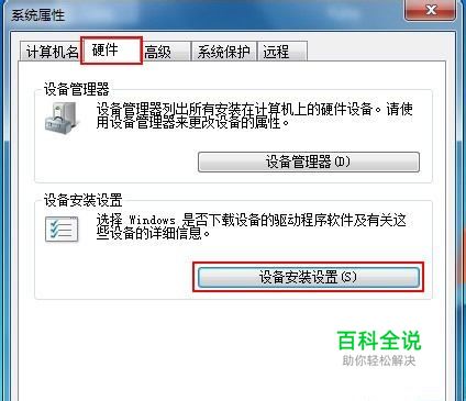 再在“系统属性”内选择“硬件”→“设备安装设置”。