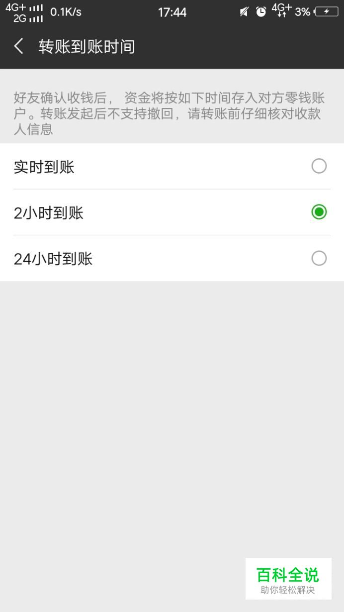 最后,点击转账到账时间,再点击“2小时到账”即可。