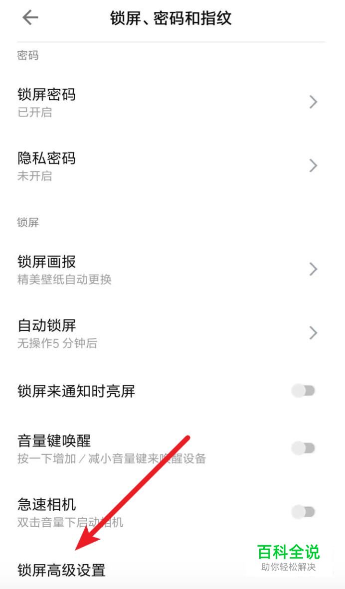 在这个选项页面,点击打开下方的‘锁屏高级设置’。
