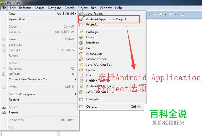 首先打开Eclipse ADT软件,点击顶部的File菜单,然后选择New下面的Android Application Project选项,如下图所示