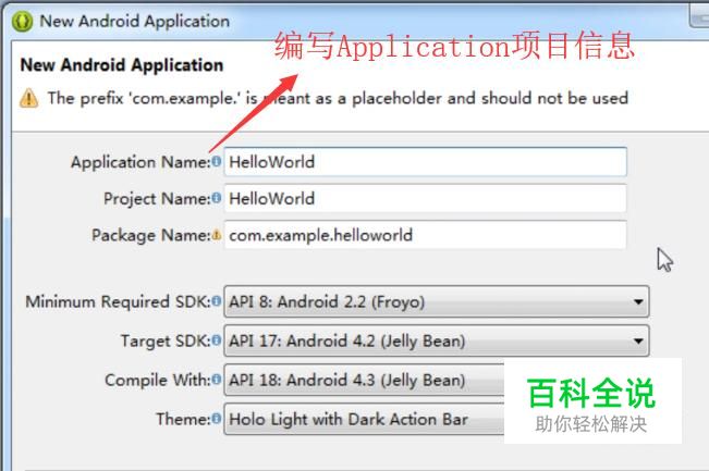 接下来在弹出的New Android Application界面中编写Application的项目信息,如下图所示