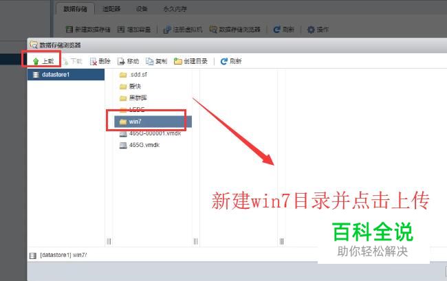 接下来在弹出的数据存储浏览器界面中我们新建一个win7的目录,然后点击上传按钮,如下图所示