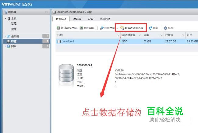 首先我们打开Vmware ESXI软件,选择左侧的存储选项,然后点击数据存储浏览器,如下图所示