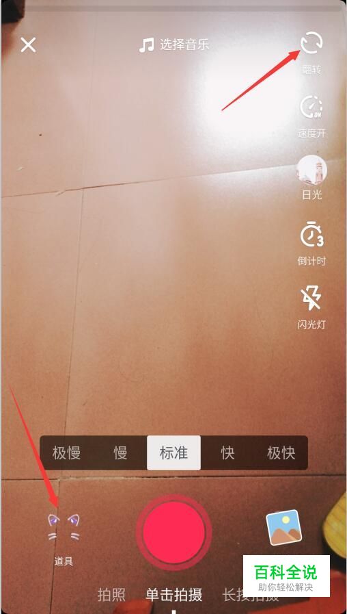 进入拍摄界面,点击右上角的翻转按钮,再点左下角的道具按钮。