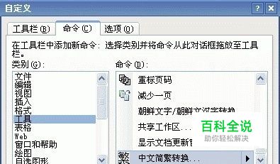 调出Word中简繁体字互相转换按钮 首先打开Word,将转换工具的按钮调出来,视图-->工具栏-->子定义-->命令-->工具,在右边找到“中文繁简转换”,然后用鼠标左键按住不动,将其拖到工具拦上。如图: