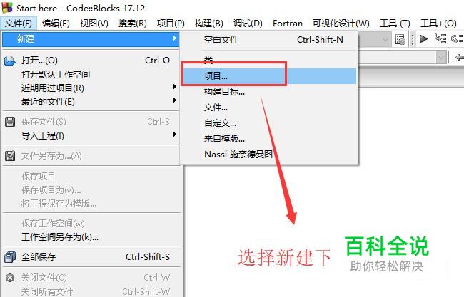首先打开Code Blocks软件,点击左上角的文件菜单,选择新建下面的项目,如下图所示