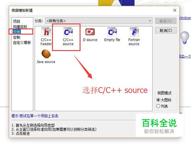 接下来在弹出的新建界面,我们选择左侧的文件选项,然后选择右侧的C/C++ source选项,如下图所示