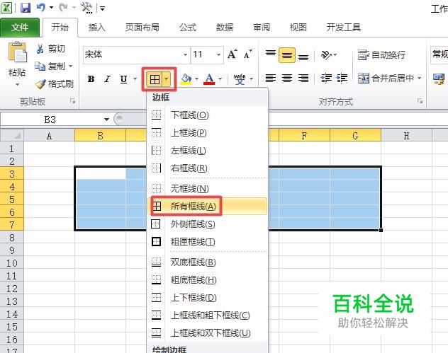 之后我们点击边框按钮边上的下拉箭头,弹出的界面,我们点击所有边框;