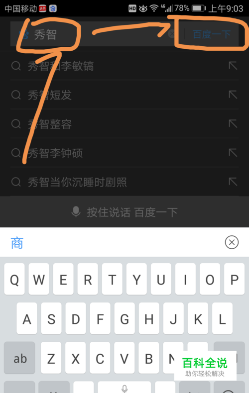 进入手机百度后在上方箭头指向位置输入要搜索壁纸的关键字,然后点按百度一下。