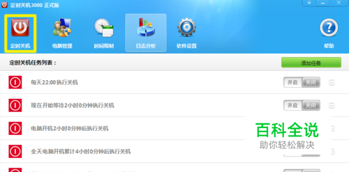 现在定时关机的软件很多,小编使用的是定时关机3000,这取决于个人喜好,在这里我就不便多说了。打开软件,点击“定时关机”按钮,软件已经预设了6种关机条件。如果你需要其他执行条件的话,可以点击右上角的“添加任务”。