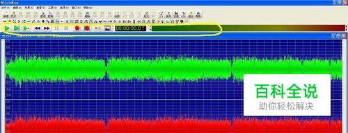 打开音乐后,我们可以看到音乐的波形图。黄色区域为音乐播放器,黑色方框中显示的数字为音乐的时间点。我们可以点击左边第一个绿色箭头(播放按钮)试听歌曲,记住自己想要裁剪的时间段(比较关键,这样会很精确的确认自己想要的音乐片段)。