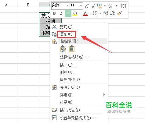 点击复制选项在另外的一列处选择单元格单击鼠标右键找到粘贴选项,如图所示: