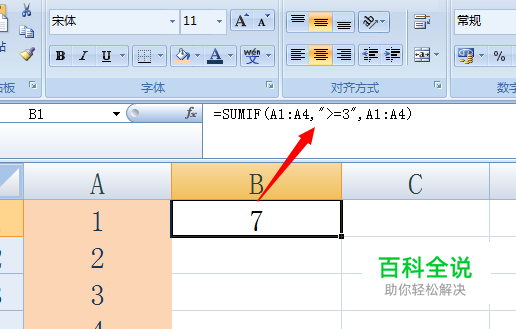 接着在B1单元格中输入【=SUMIF(A1:A4,">=3",A1:A4)】,按回车键即可对A列中满足大于或等于3的单元格进行求和操作。