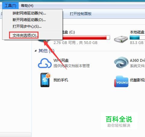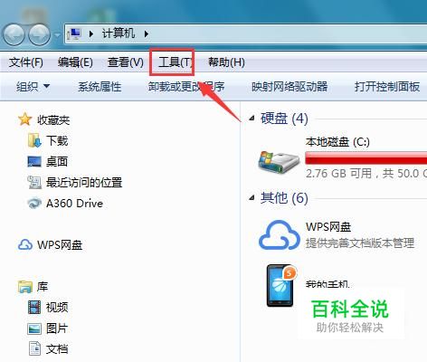 双击计算机图标将其打开,在弹出的对话框内找到工具选项,如图所示: