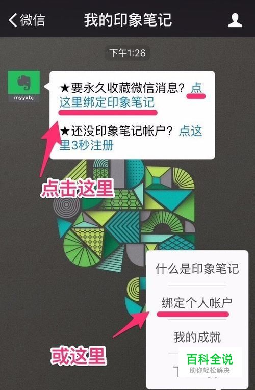 以下是开启这个功能所需的步骤: (1)打开微信,点击主界面右上角的【添加朋友】,搜索【我的印象笔记】 (2)关注公众号【我的印象笔记】,你会收到一条消息 (3)点击相应链接,绑定印象笔记帐户,或点击右下角【更多功能】中的【绑定个人帐户】
