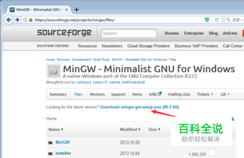 在打开的MinGW代码托管页面中,点击“Download mingw-get.setup.exe”下载MinGW管理器程序(需要等待几秒才会弹出文件保存提示);