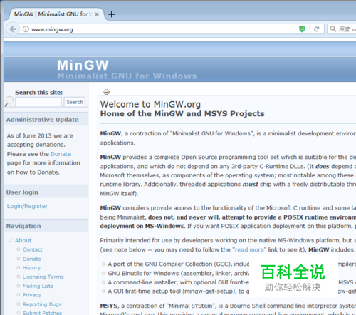 打开浏览器,进入网站http://www.mingw.org,然后点击页面左侧的Downloads链接;