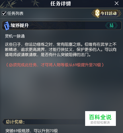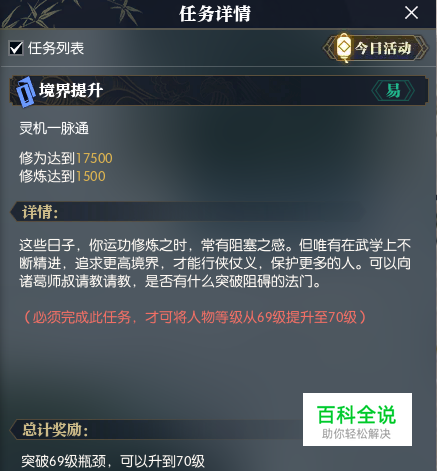 第一步: 玩家到达69级后,可领取境界提升任务,此任务可突破69瓶颈,升到70级,如下图