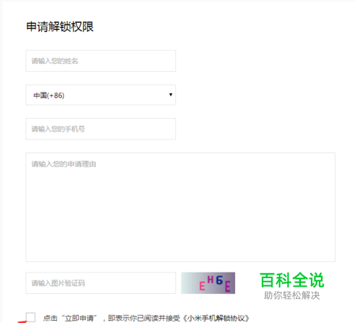 接下来按照要求填写信息,并且在《解锁协议》前打上勾。