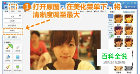 在“美图秀秀”中打开原图,在“美化”菜单下将清晰度调至最大,初步增大照片的清晰度。