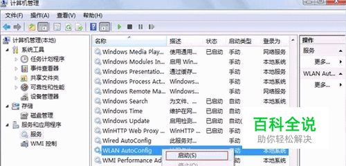 选择“服务和应用程序”中的“服务”,在右边列表中找到“WLAN AutoConfig”,右键选择“启动”。