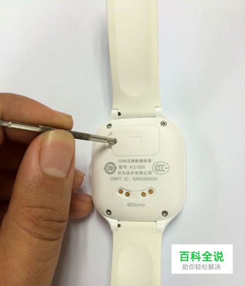 现在看到的是手表后盖,我们用螺丝刀把后盖的1颗小螺丝旋转下来,粗心的家长不要怕螺丝丢了,包装内还附带1颗备用螺丝。