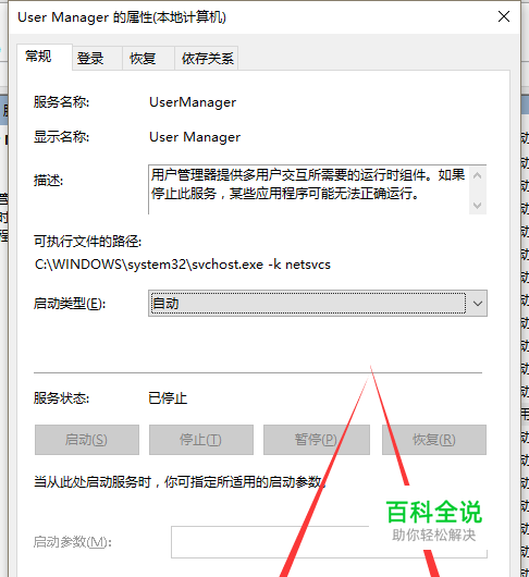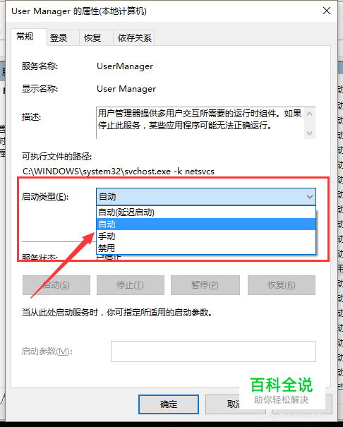 进入后,选择“启动类型”,把“禁用”改为“自动”,依次点击右下角的“应用”和“确定”。重启电脑,这样我们的问题就解决了