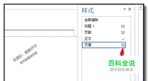 文档右侧弹出样式窗格; 找到页眉样式;在页眉右侧这里点一下,再点修改。