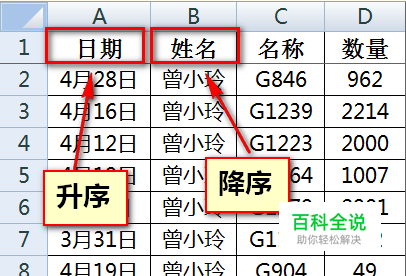 如下图,需要对【日期】列进行升序排列,对【姓名】列进行降序排列。