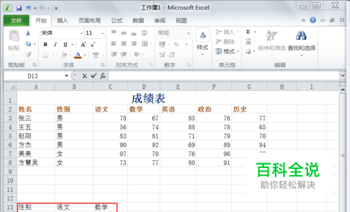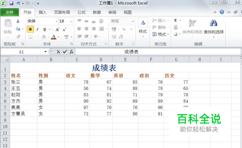 打开Microsoft excel 2010 ,输入相应的数据,以成绩表为例