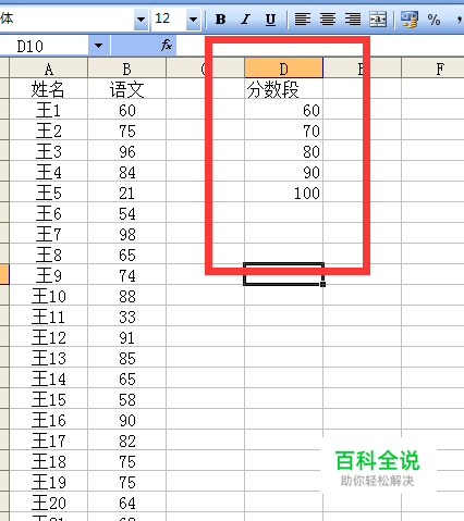 在后面找一列输入分数段60、70、80、90、100。